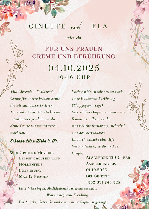 Ich freue mich meine Freundin und Heilern Ginette Fritsch aus Luxemburg gewinnen zu können, für diesen schönen Workshop, den wir bisher nur in Luxemburg miteinander gestalten haben.